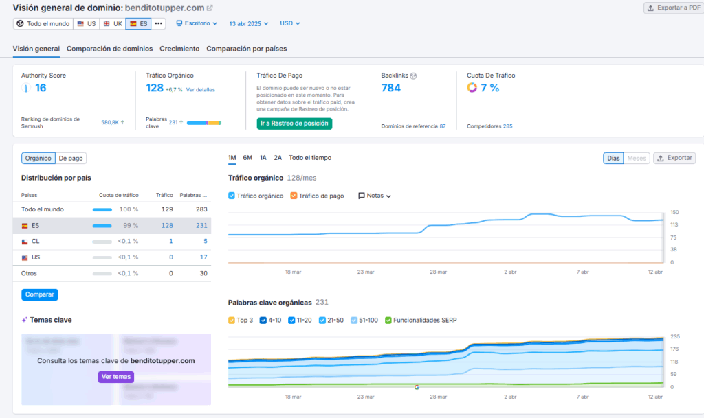 Bendito Tupper comenzó con un volumen de tráfico orgánico bajo. Gracias a una estrategia SEO sólida y bien estructurada, ha logrado superar las 120 visitas orgánicas mensuales, posicionándose para términos clave como “tupper a domicilio Barcelona” y “comida preparada Barcelona”. Este es un claro ejemplo del impacto tangible que puede generar una estrategia de posicionamiento bien ejecutada.