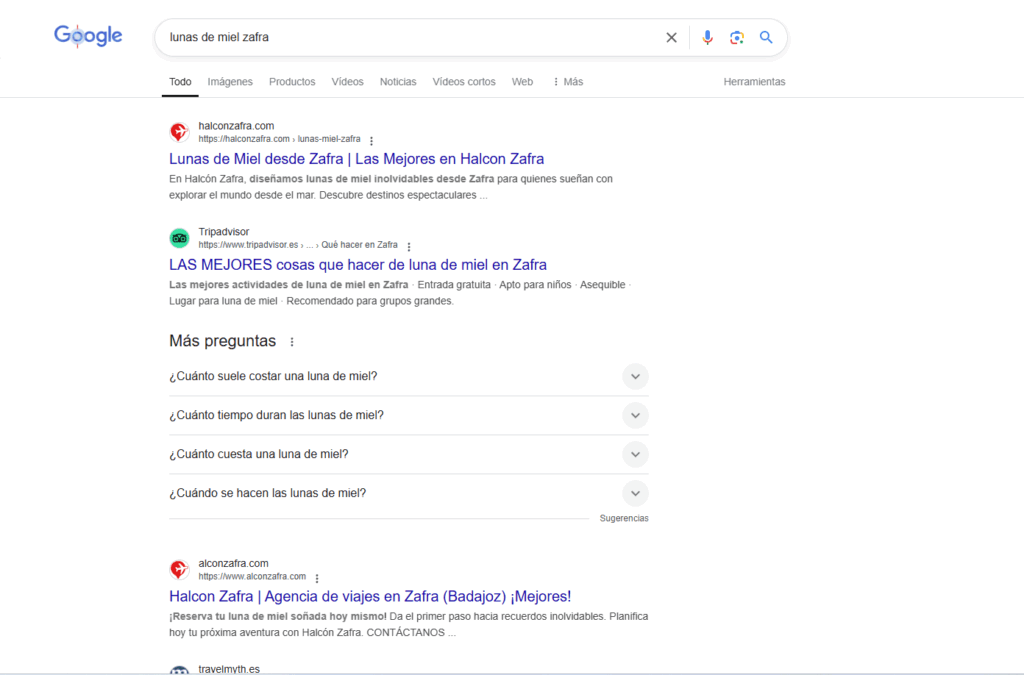 Halcon Zafra acudió a nosotros sin presencia orgánica en los buscadores. Gracias a una estrategia SEO bien definida y enfocada en términos clave como “agencia de viajes en Zafra” y “cruceros en Zafra”, hemos logrado aumentar notablemente su visibilidad online. Este caso de éxito demuestra el impacto tangible de una estrategia de posicionamiento bien ejecutada.