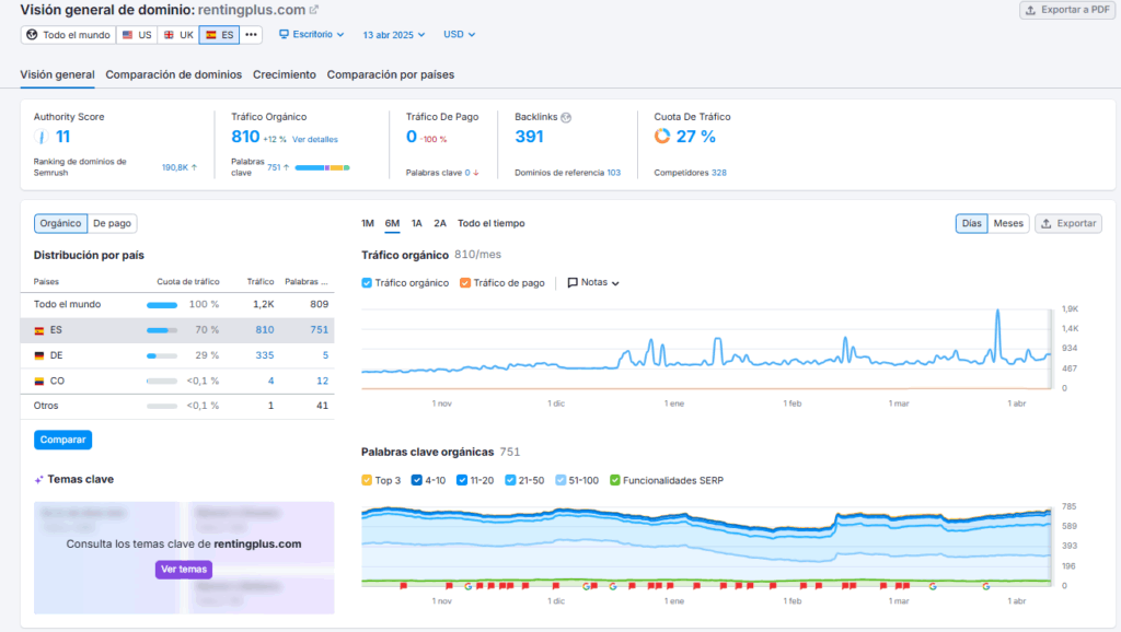 Renting Plus comenzó con un tráfico orgánico reducido. Gracias a una estrategia SEO sólida y bien definida, ahora se posiciona para términos clave como “renting Madrid sin entrada” y “coches renting Madrid baratos”, superando las 800 visitas orgánicas mensuales. Este es un claro ejemplo del impacto tangible que puede generar una estrategia de posicionamiento bien ejecutada.